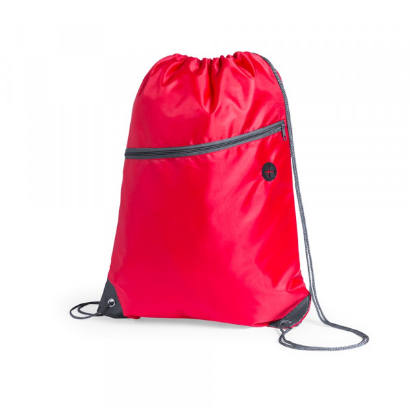 Rucksack mit Kordelzug aus weichem 210D Polyester in verschiedenen kräftigen Farben. Fronttasche mit Reißverschluss, Kopfhörerausgang und Zugbänder in Grau sowie farblich passender Reißverschluss. Ecken mit Metallösen und Kunstlederverstärkung.