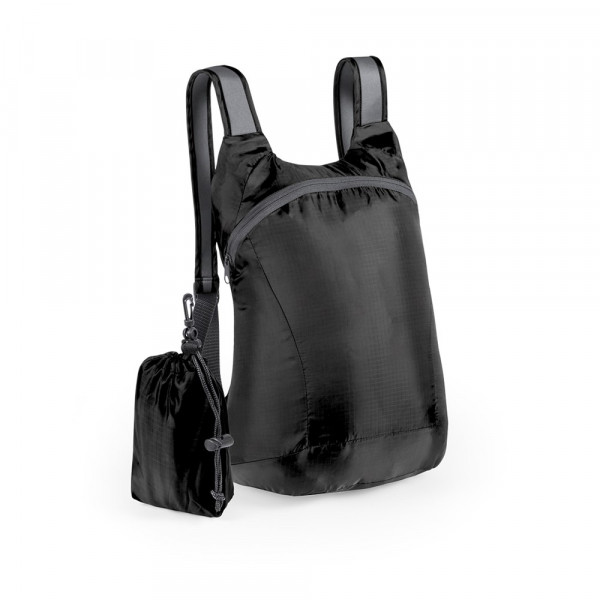 Faltbarer Rucksack aus angenehm weichem, jedoch robustem Ripstop-Material in lebhaften Farben. Mit Reißverschluss und Kontrastdetails in Grau sowie verstellbaren Schultergurten und reflektierenden Einsätzen. Faltbar auf kleine Größe. Inklusive Beutel zum Verstauen - mit Befestigungskarabiner und Trageschlaufe.