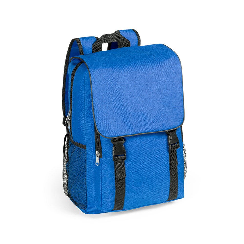 Rucksack aus robustem 600D Polyester mit auffälligem Design in verschiedenen Farben. Klappe mit Schnallenverschluss, Doppelreißverschluss und Fronttasche. Elastische Netztaschen an den Seiten, verstärkte Ecken und schwarze Kontrastdetails sowie verstellbare Schultergurte mit Polsterung.