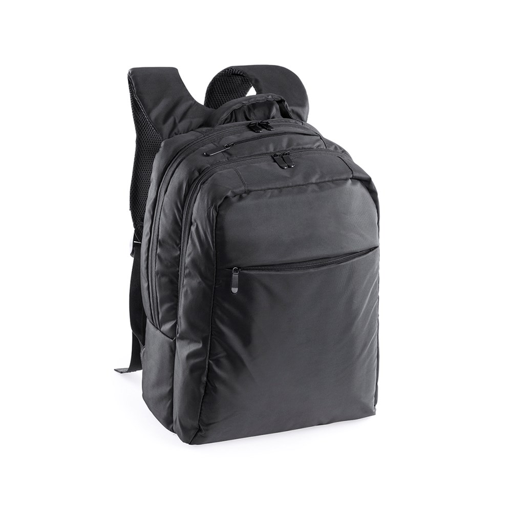 Resistenter Rucksack aus 600D Nylon mit Reißverschluss, Fronttaschen und verstärktem Griff sowie ergonomischem Rückenpanel mit Polsterung und gepolsterten Schultergurten. Bietet zudem ein gepolstertes Innenfach für einen Laptop von bis zu 15 Zoll.