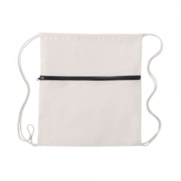Rucksack mit Kordelzug aus 100 % Baumwolle. Mit Reißverschluss-Fronttasche in verschiedenen kräftigen Farben und farblich passenden Zugbändern sowie verstärkten Ecken.