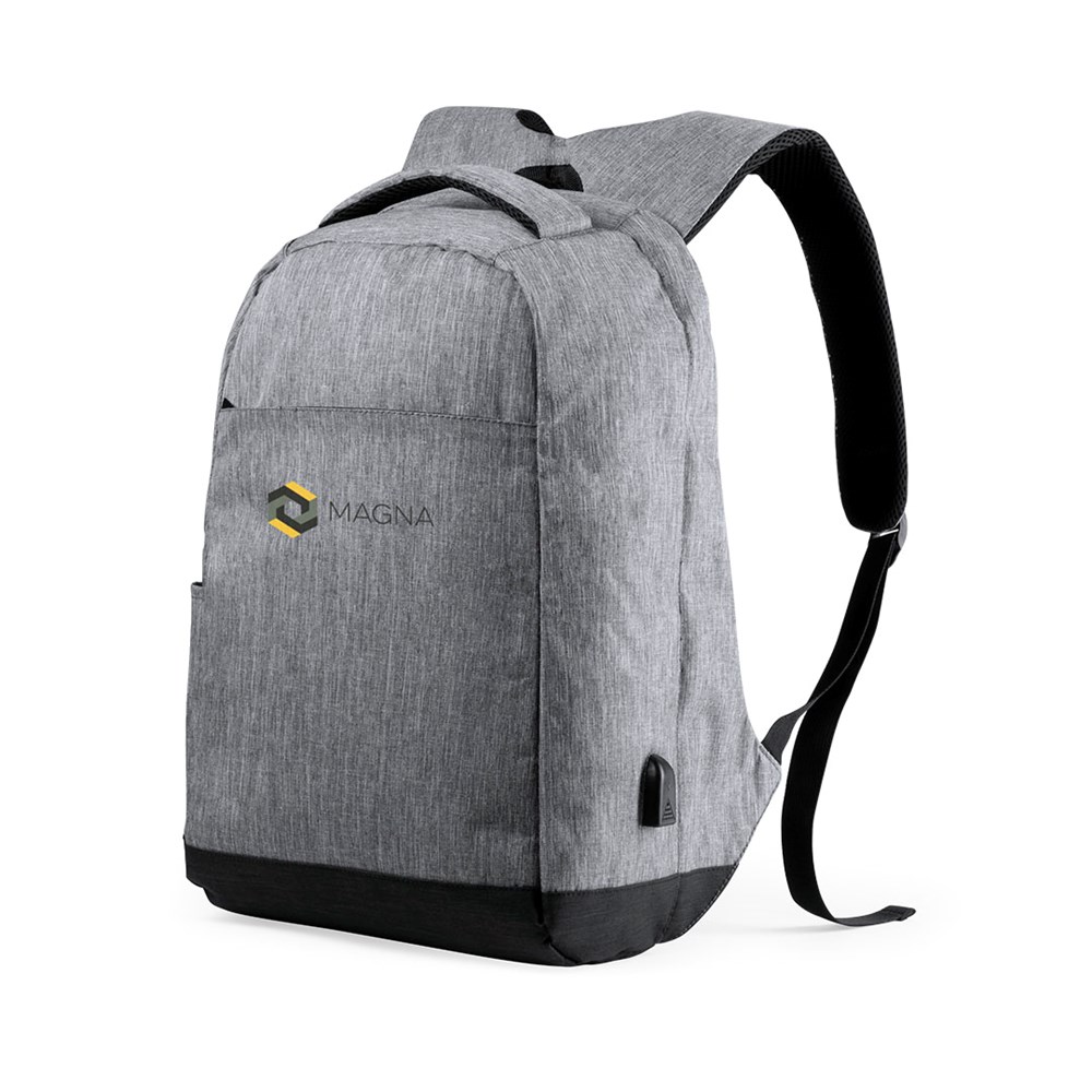 Business-Rucksack aus widerstandsfähigem 600D Polyester - wasserabweisend, gesichert gegen Diebstahl sowie schnitt- und reißfest. Erhältlich in den Farben Grau und Schwarz. Mit sicherem Fach auf der Rückseite zur Aufbewahrung von Wertsachen. Innenfach mit USB für den Anschluss eines externen Akkus (nicht inklusive). Mit Sicherheitsreißverschluss, zwei separaten, gepolsterten Innenfächern für Laptops von bis zu 15 Zoll und für Tablets von bis zu 10 Zoll sowie einer Vielzahl von Innen- und Außentaschen. Schultergurte und Rückenpanel mit ergonomischer Polsterung. Inklusive Befestigungsgurt für die Anbringung an einem Trolley.