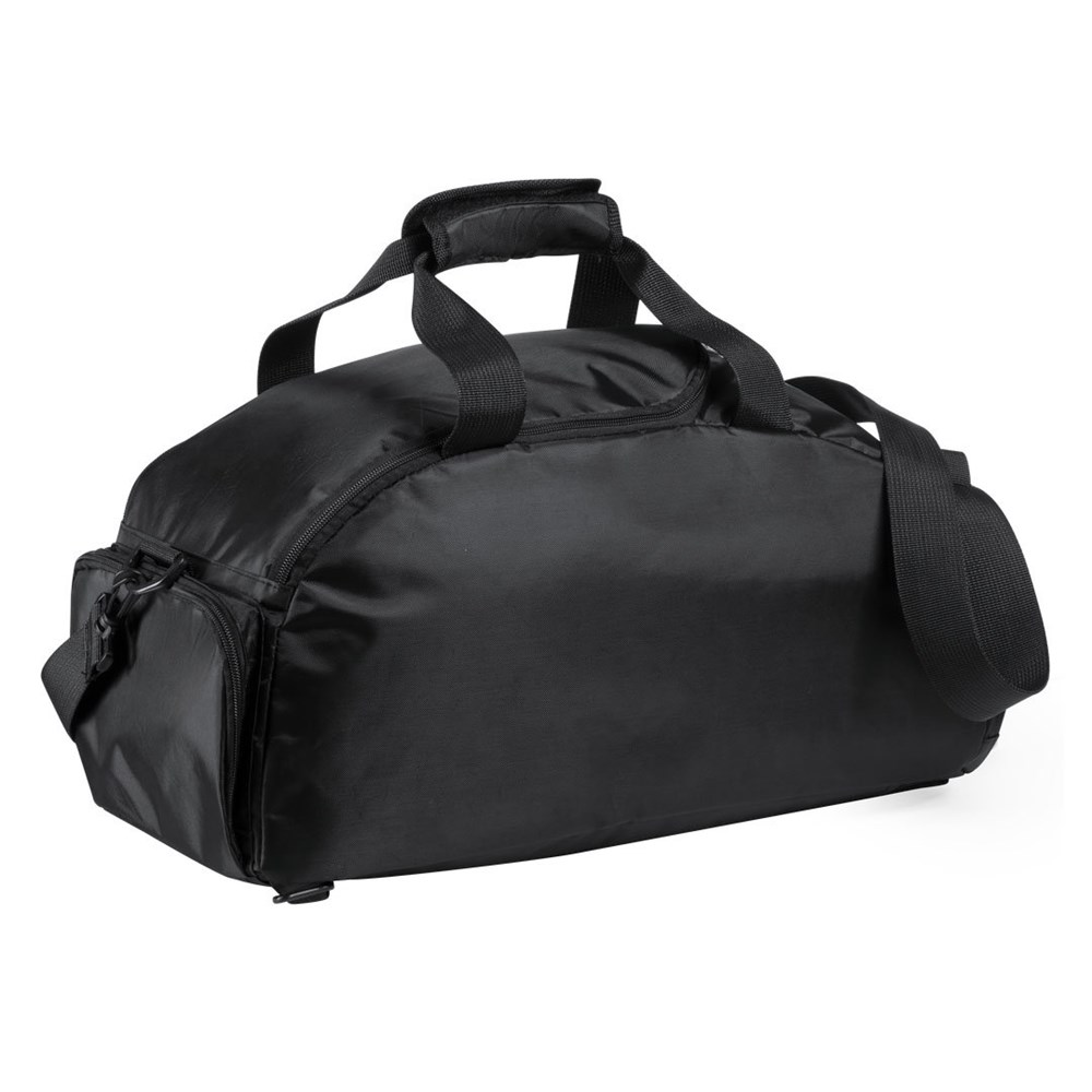 Backpack bag in resistant nylon 420D. Zippered closure compartment for footwear and side pocket with zipper closure. Main compartment with double puller zipper and reinforced carrying handles, with velcro closure. Adjustable, padded shoulder straps and padded back.