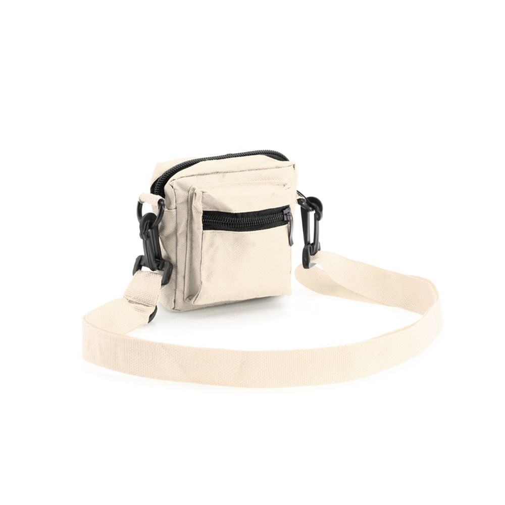 Mini-Umhängetasche aus robustem 600D Polyester in verschiedenen Farben. Mit Reißverschluss, Außentasche mit Reißverschluss, und Schlaufe für die Befestigung am Gürtel auf der Rückseite. Farblich passender, verstellbarer Schultergurt mit Karabinerbefestigung.
