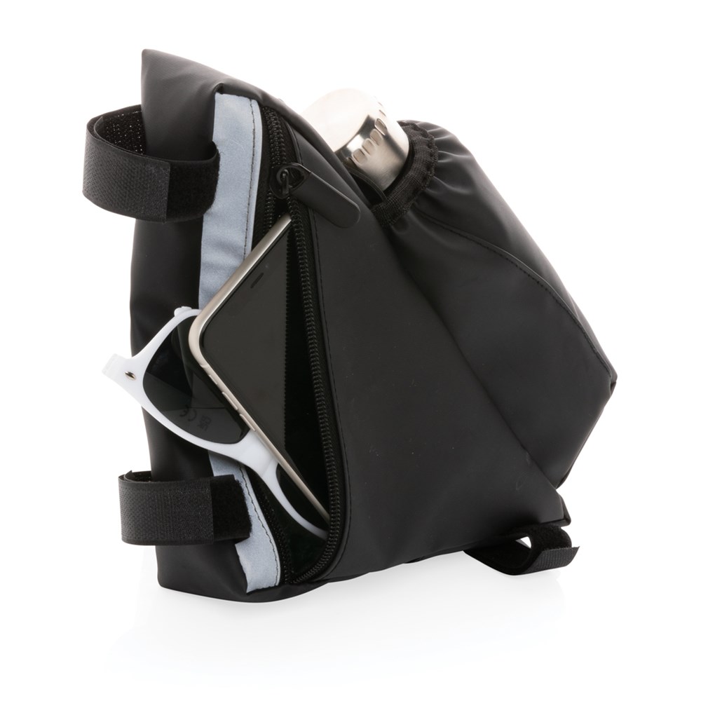 Diese gut sichtbare Fahrradrahmentasche aus PU mit Flaschenhalter ist das ideale Accessoire für eine entspannte Radtour. Sie brauchen keine weitere Tasche mehr, stecken Sie einfach das Nötigste in die Fahrradrahmentasche, so wie Ihre Flasche Wasser und los geht's! Einfache Befestigung dank der Klettbänder. Wasserabweisend. Das Reflektionsvermögen wurde gemäß EN 13356: 2001 geprüft.