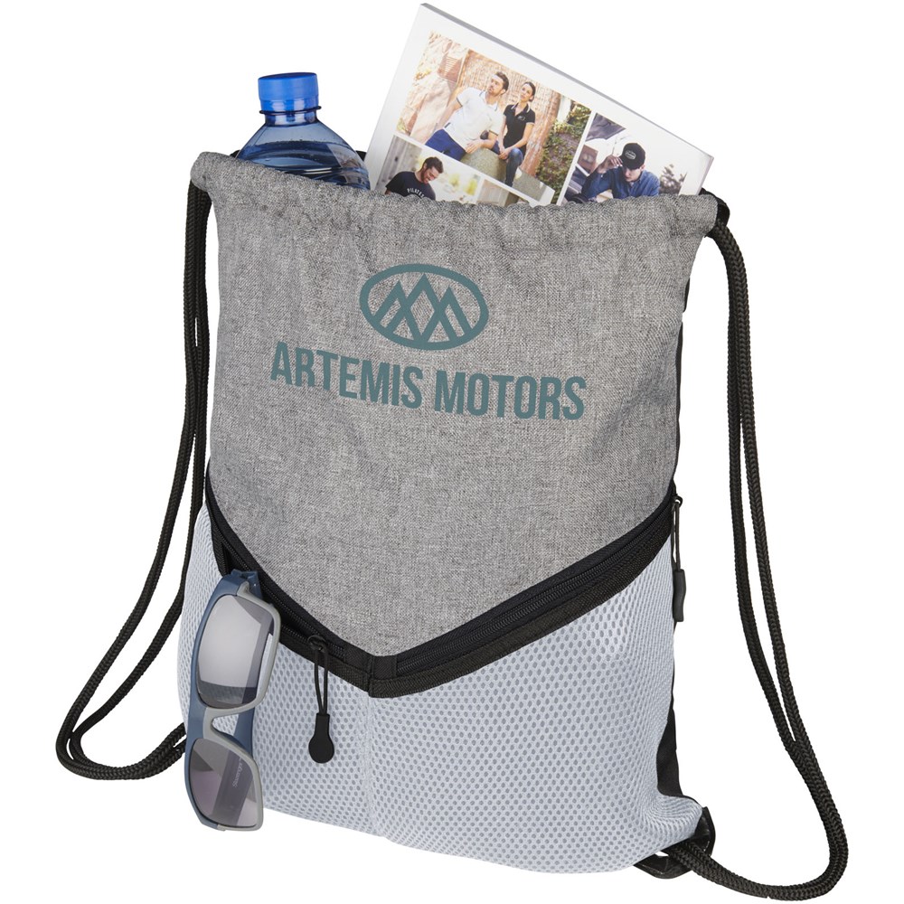 Ein sportlicher Rucksack mit einem Kordelverschluss, einem großem Hauptfach und zwei Netztaschen mit Reißverschluss.