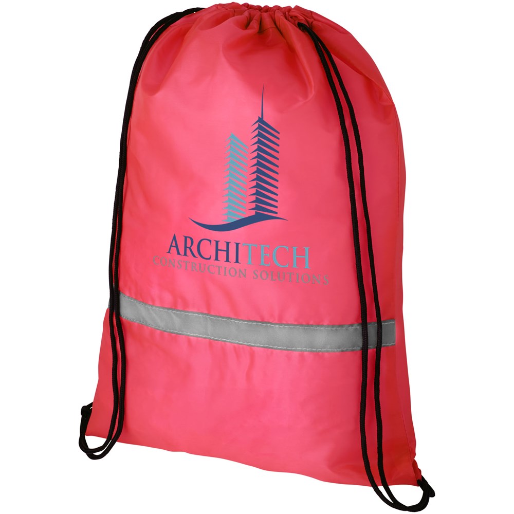 Sportbeutel, zertifiziert nach EN 13356. Großes Hauptfach mit Kordelzugverschluss. Ausgestattet mit einem reflektierenden Frontband und verstärkten Ecken. Beständigkeit bis zu 5 kg.