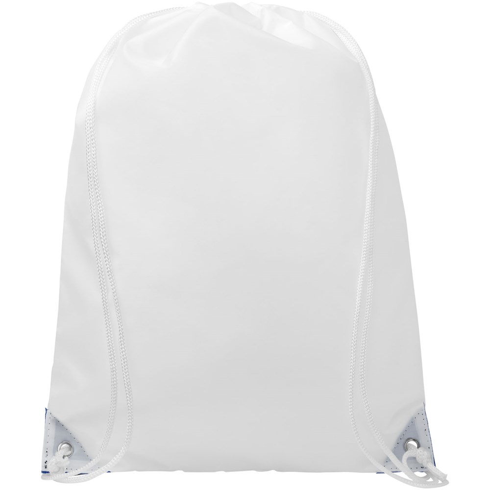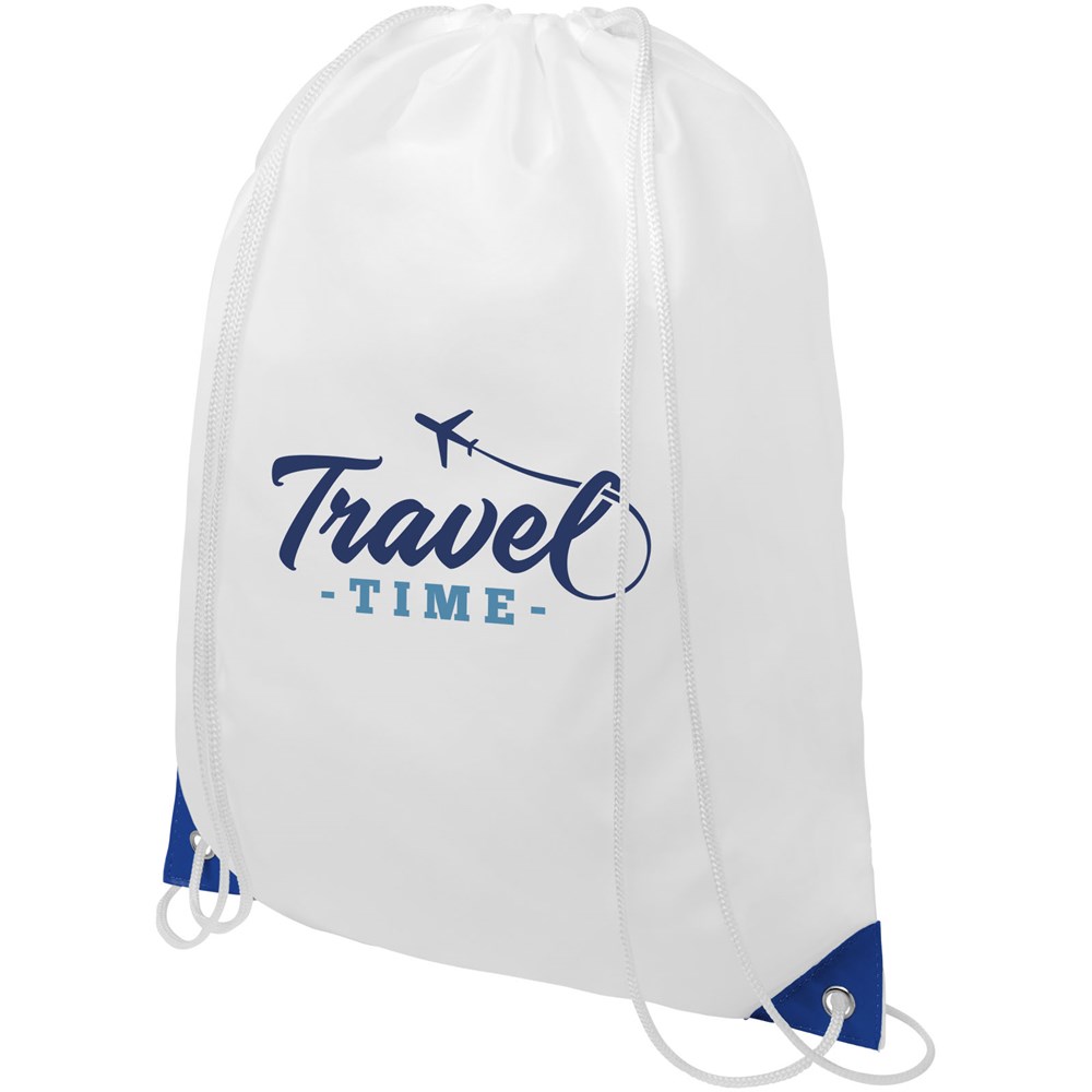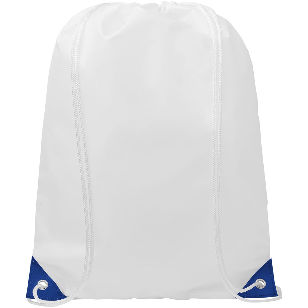 Sportbeutel mit Hauptfach und Kordelzugverschluss in weißer Farbe. Ausgestattet mit gefärbten verstärkten Ecken. Beständigkeit bis zu 5 kg.
