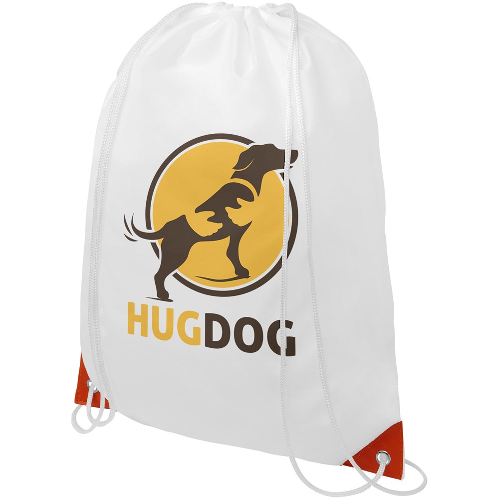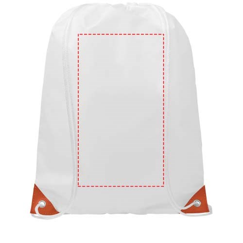 Sportbeutel mit Hauptfach und Kordelzugverschluss in weißer Farbe. Ausgestattet mit gefärbten verstärkten Ecken. Beständigkeit bis zu 5 kg.
