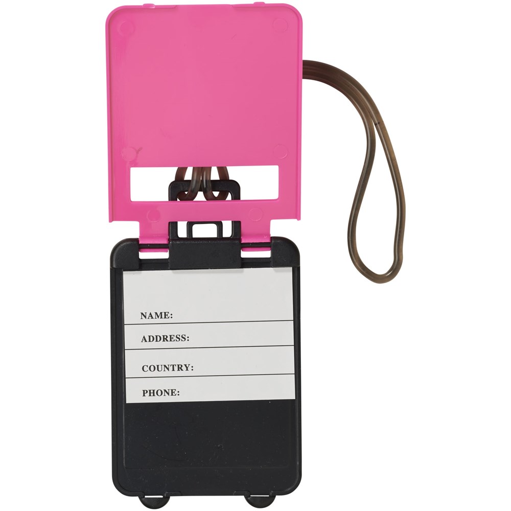 Kofferanhänger zum Aufklappen mit Gummizug. Ausweiskarte innen.