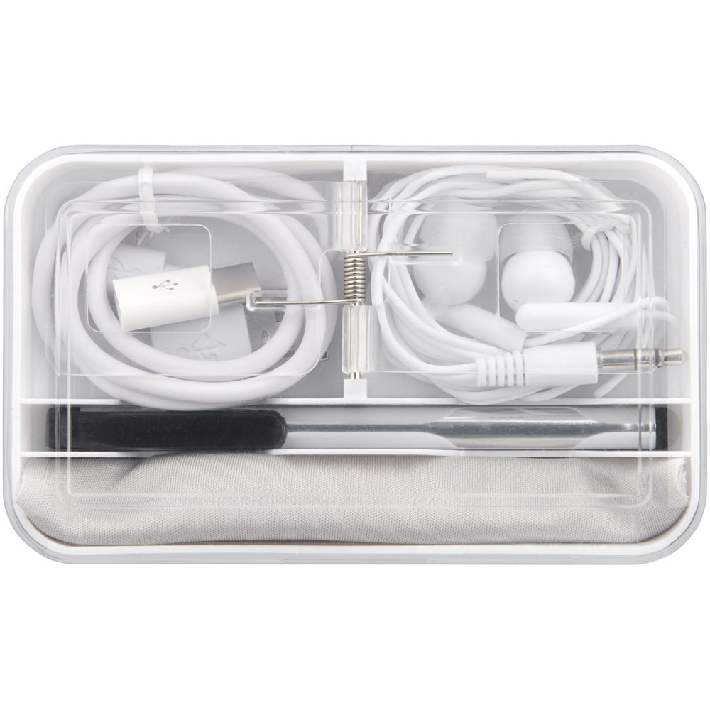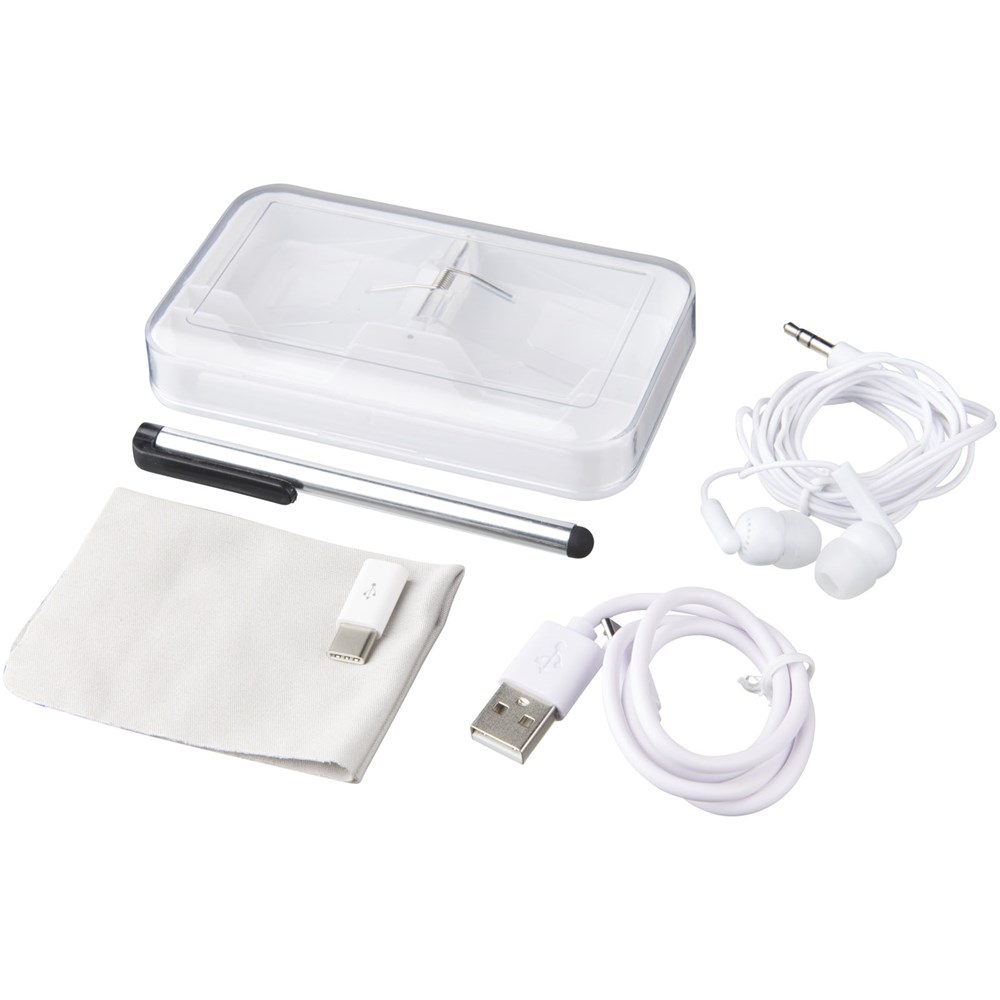 Dieses Reiseset für Ihr Mobiltelefon beinhaltet alles, was Sie unterwegs auf Reisen benötigen. Enthält Kopfhörer, ein Micro-USB-Ladekabel, einen Touchpen, ein Mikrofasertuch, einen Typ-C-Adapter und eine dekorative Box zur bequemen Aufbewahrung.