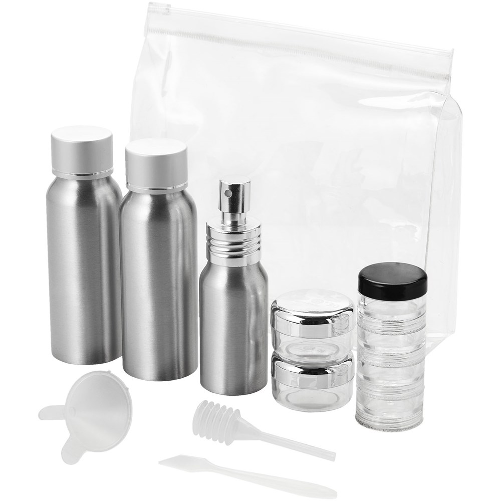 Enthält 2 80 ml Aluminiumflaschen, 1 30 ml-Aluminium Sprühflasche, 2 0,5 ml Gläser, 1 Glas mit 4 Ebenen, einen Trichter, einen Spatel und einen Sauger. Flaschen, Trichter usw. im Kunststoffbeutel verpackt, werden getrennt vom Beutel geliefert.