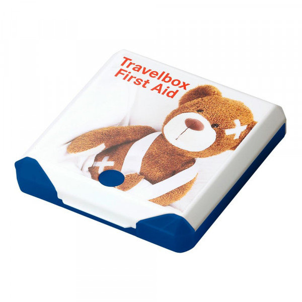 Quadratische, praktische Box aus Kunststoff mit Klickverschluss, der sich auch ganz leicht mit einer Hand öffnen lässt. Befüllt mit 10 wasserfesten und 10 normalen Qualitätspflastern von Hartmann und 1 Hygienetuch.