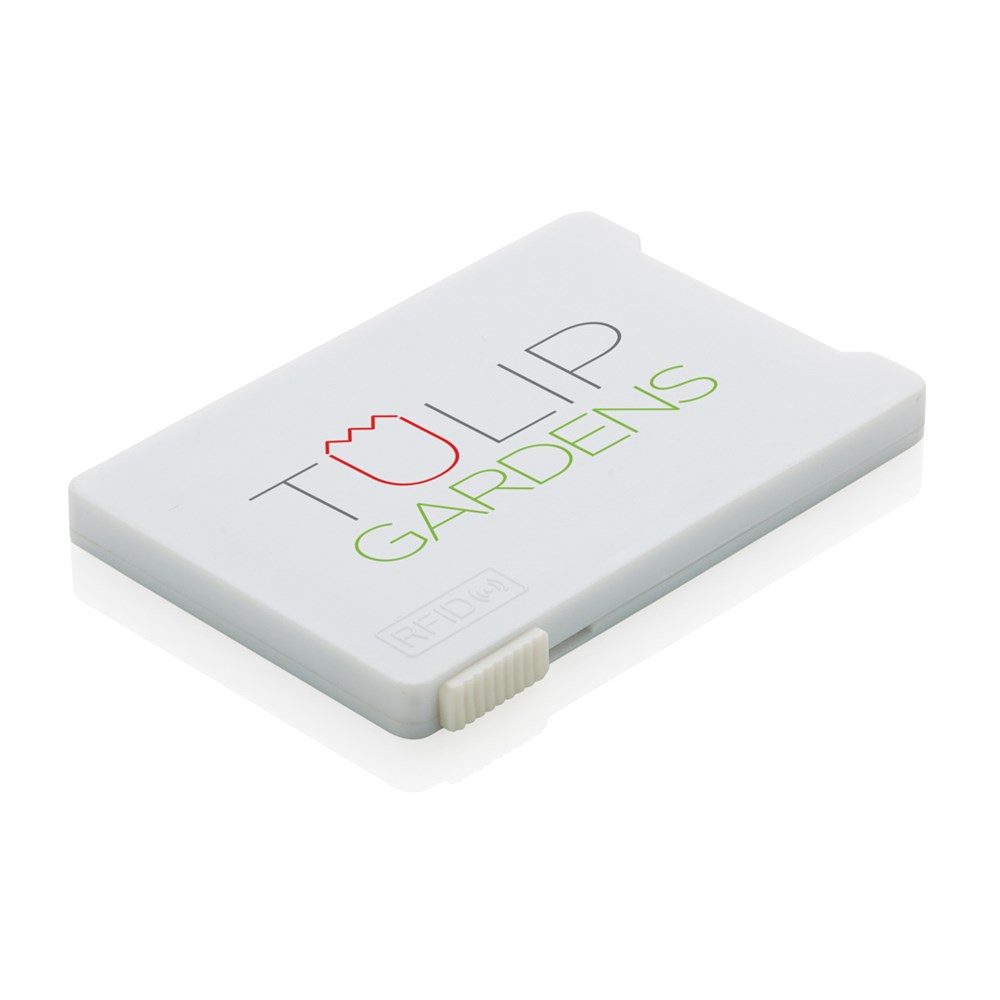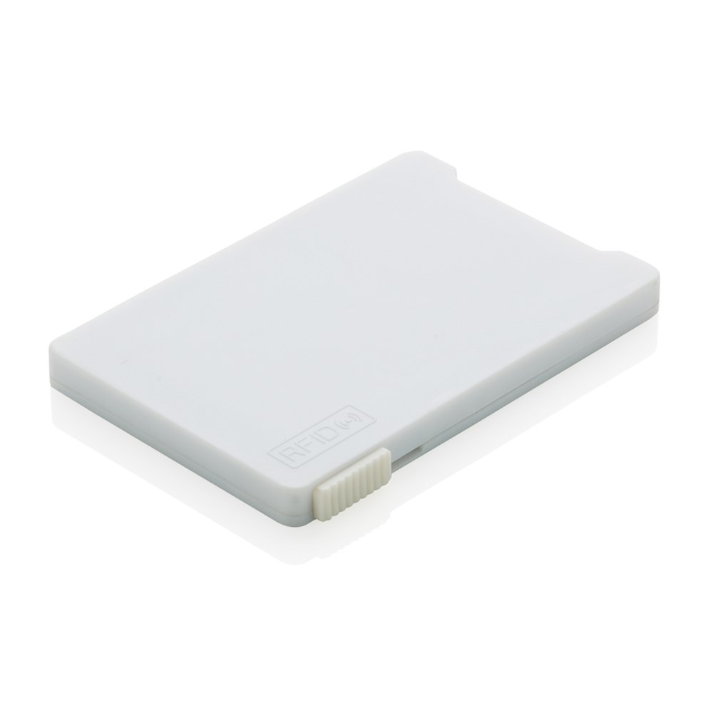 Dieser RFID-Karthalter schützt bis zu 4 Karten oder bis zu 3 mit Prägung vor unerwünschtem Datendiebstahl. Der Schieber auf der Seite bringt die Karten zum Vorschein. Registered design®