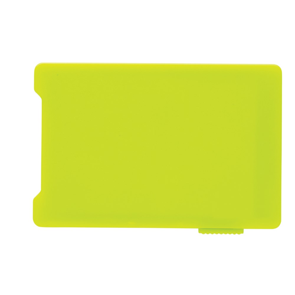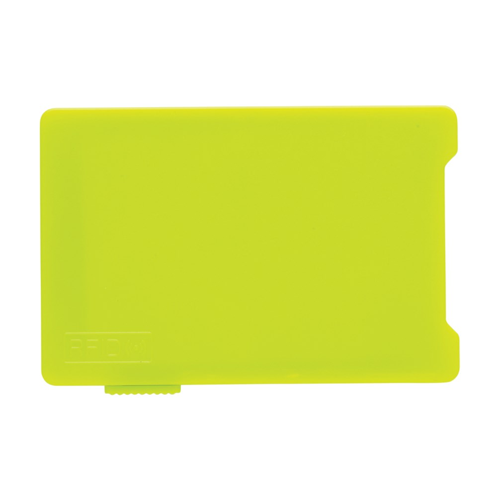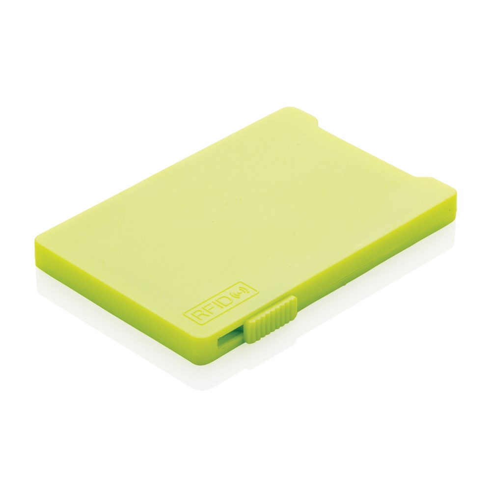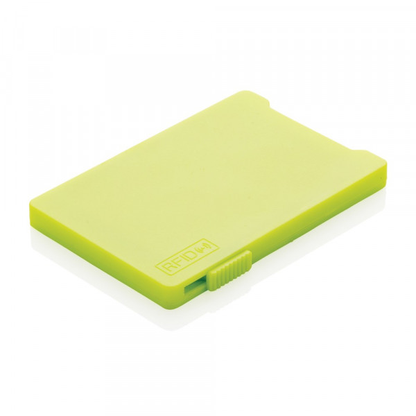 Dieser RFID-Karthalter schützt bis zu 4 Karten oder bis zu 3 mit Prägung vor unerwünschtem Datendiebstahl. Der Schieber auf der Seite bringt die Karten zum Vorschein. Registered design®