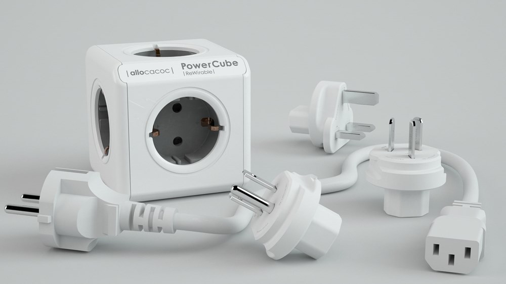 Der PowerCube ReWirable ist eine elegante Reisebuchse mit 5 integrierten Buchsen.
