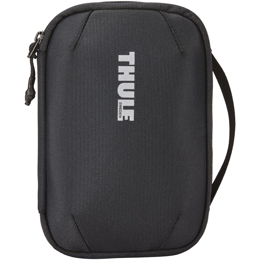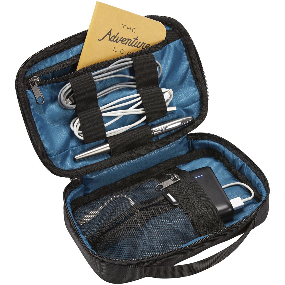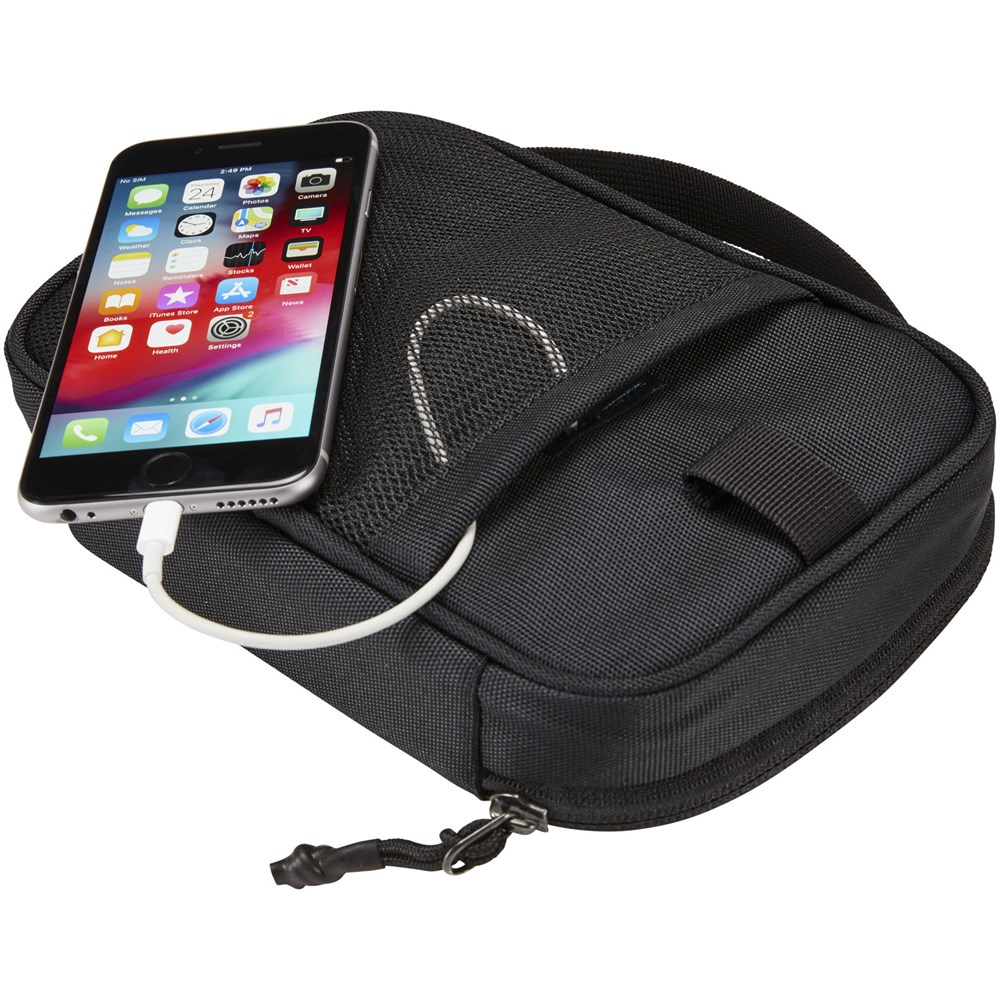 Zubehörtasche zur Aufbewahrung von Powerbanks, Ohrhörern, Ladekabeln oder anderem elektronischen Zubehör. Kommt mit 5 elastischen Schlaufen und zwei Reißverschlusstaschen. Das Einsteckfach und der Kabeldurchgang ermöglichen die Aufbewahrung einer Powerbank im Gehäuse, während Ihr Gerät aufgeladen wird.