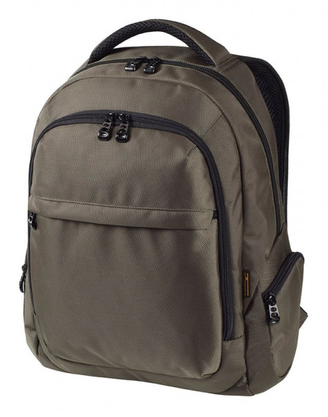 Hauptfach mit gepolstertem Notebookfach und Einsteckfach; große gepolsterte Reißverschluss-Vortasche mit Einsteckfächern, Schlüsselanhänger und Handytasche; Reißverschluss-Vortasche; seitliche Reißverschluss-Taschen; gepolsterter Rücken, Schultergurte und Handgriff
