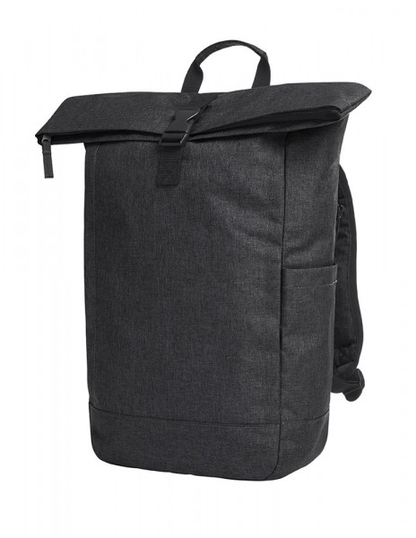 urbaner Rucksack mit Reißverschluss-Hauptfach und Steckverschluss; rPET-Obermaterial; gepolstertes Einsteckfach und Organizer-Elemente innen; seitliche Reißverschluss-Vortasche; zwei seitliche Einsteckfächer für z.B. Trinkflaschen; rückseitige Reißverschluss-Tasche; gepolstertes Tragesystem; Handgriff