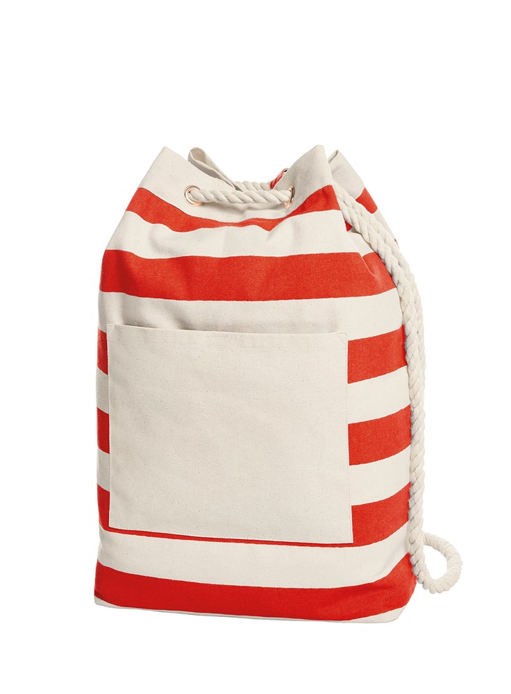 junger Rucksack mit frischem Blockstreifen-Dekor; großzügiger Schnitt mit geradem Rücken; große Vortasche mit Klettverschluss; dekorative Ösen und Träger aus dicker Baumwollkordel