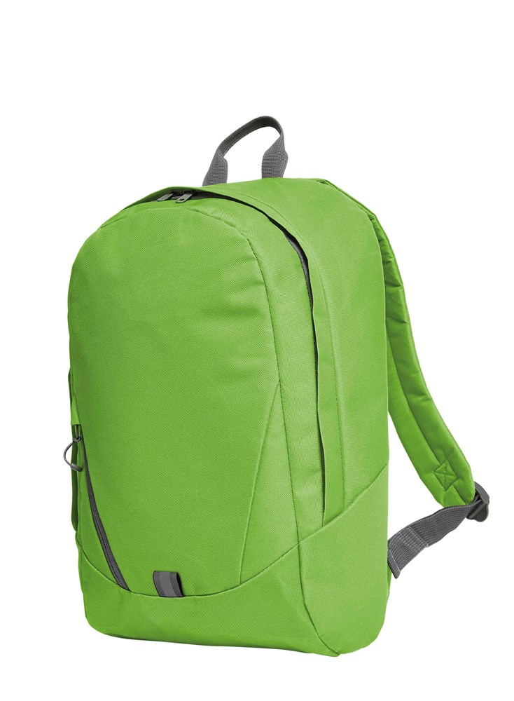 moderner Rucksack mit Reißverschluss-Vortasche; Hauptfach mit 2-Wege-Reißverschluss und flachem Einsteckfach innen; Regenklappe; Reflektor-Streifen vorne, Rücken und Schultergurte gepolstert; Handgriff