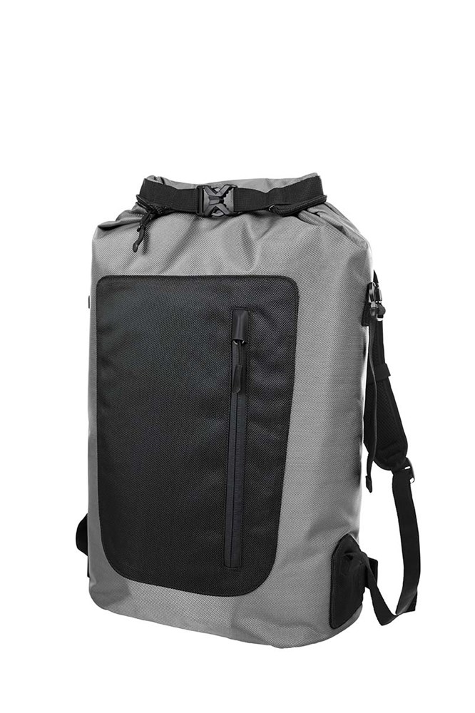 geräumiges Reißverschluss-Hauptfach mit Wickelverschluss; seitlich zusätzliche Verschlussmöglichkeit durch Steckschnallen; flache Reißverschluss-Vortasche; gepolsterter Rücken mit integriertem Reißverschluss-Fach; längenverstellbare gepolsterte Schultergurte mit höhen- und weitenverstellbarem Brustgurt; Handgriff