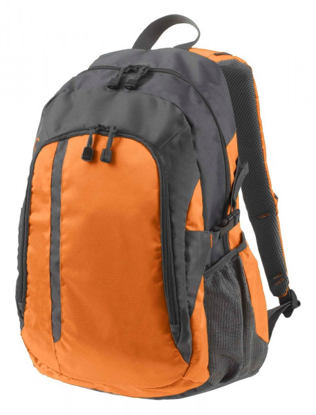 großes Hauptfach mit Einschubfach; seitliche Netztaschen und Zurrgurte; große Reißverschluss-Vortasche mit Einsteckfächern und Kopfhörerausgang; aufwändig gestaltete und gepolsterte Schultergurte