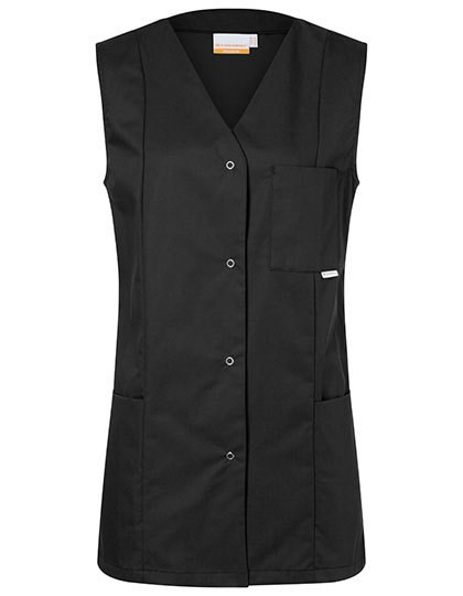 Köpergewebe, 215 g/m² | Hochveredelt, gekrumpft, waschecht, pflegeleicht | Damenkasack in lockerer Passform | Englische Nähte | V-Ausschnitt, ohne Ärmel | 2 versteckte Seitentaschen | 1 aufgesetzte Brusttasche links | 4 Druckknöpfe | Rückenlänge bei Größe 38 ca. 82 cm | Industriewäschetauglich | Waschbar bis 95°C