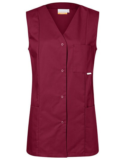 Köpergewebe, 215 g/m² | Hochveredelt, gekrumpft, waschecht, pflegeleicht | Damenkasack in lockerer Passform | Englische Nähte | V-Ausschnitt, ohne Ärmel | 2 versteckte Seitentaschen | 1 aufgesetzte Brusttasche links | 4 Druckknöpfe | Rückenlänge bei Größe 38 ca. 82 cm | Industriewäschetauglich | Waschbar bis 95°C