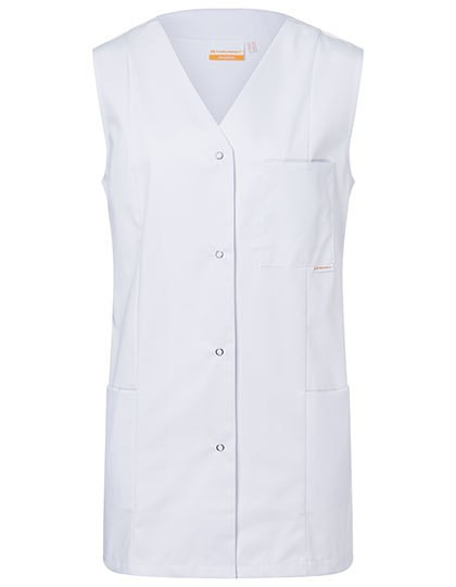 Köpergewebe, 215 g/m² | Hochveredelt, gekrumpft, waschecht, pflegeleicht | Damenkasack in lockerer Passform | Englische Nähte | V-Ausschnitt, ohne Ärmel | 2 versteckte Seitentaschen | 1 aufgesetzte Brusttasche links | 4 Druckknöpfe | Rückenlänge bei Größe 38 ca. 82 cm | Industriewäschetauglich | Waschbar bis 95°C