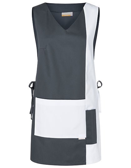 Köpergewebe, 215 g/m² | Hochveredelt, gekrumpft, waschecht, pflegeleicht | Überwurfkasack für Damen, mit Brustabnähern | 2 frontal aufgesetzte Taschen | Seitlich zum Binden | Rückenlänge bei Größe I ca. 83 cm | Industriewäschetauglich | Waschbar bis 60°C (Anthrazit bis 95°C)