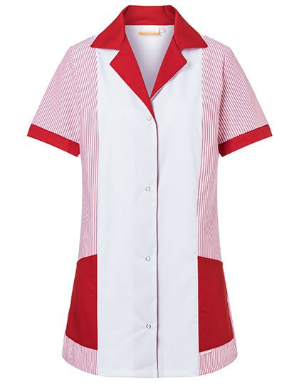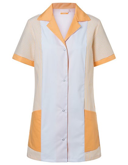Leinwandgewebe, 180g/m² (gestreift) | Hochveredelt, gekrumpft, waschecht | Köpergewebe, 215 g/m² (unifarben) | Damenkasack mit englischen Nähten | Kurze Ärmel | 2 seitliche Eingrifftaschen | Schmuckgürtel am Rücken | Rückenlänge bei Gr. 38 ca. 83 cm | Industriewäschetauglich | Waschbar bis 60°C