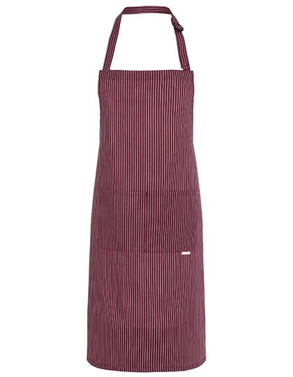 Köpergewebe, 185 g/m² | Hochveredelt, gekrumpft, farbig bedruckt, weiße Nadelstreifen | Latzschürze mit Bändern aus Schürzenstoff, mit Nahtsicherung | Latzband mit Schnalle zum stufenlosen Einstellen der Länge bis 70 cm | Aufgesetzte Tasche mit 2 Fächern, 34 x 18 cm | Waschbar bis 40°C
