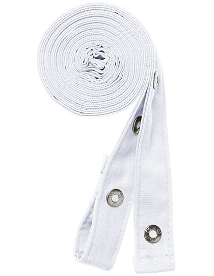 Zwei Bänder für Latzschürzen, je 230 cm lang und 2,5 cm breit | Mit Druckknopf zum Befestigen an der Schürzen-Öse | Im Rücken gekreuzte Bänder zur Entlastung des Nackens und stufenlosen Verstellung | Hochveredeltes Mischgewebe | Knitterarm | Strapazierfähig | Bis 95 °C waschbar | Industriewäsche- und finishertauglich