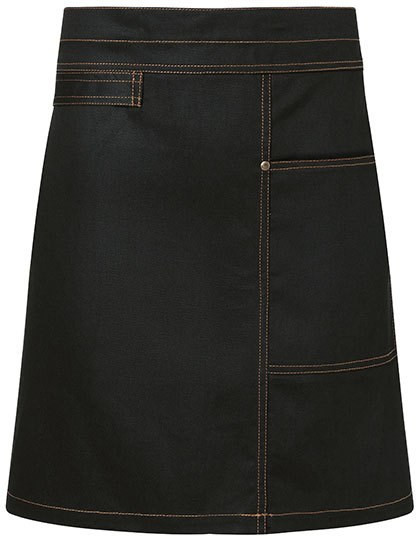Köpergewebe, 273 g/m² | Waschecht | Vorbinder in Twill-Optik mit Bändern aus Schürzenstoff | Bronzierte Nieten und kontrastfarbige Steppnähte | Praktische Stoffschlaufe auf der rechten Seite zum Befestigen eines Kassierhalfters oder Geschirrtuchs | Linksseitig, aufgesetzte Tasche (19 x 21 cm) | Waschbar bis 60 °C