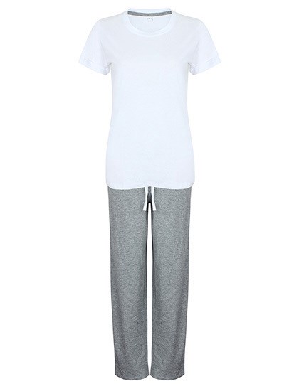 Weißes T-Shirt mit Stulpen | Graumelierte Hose mit elastischem Bund | Graumelierte Tasche mit Zugkordel | Weiches, leichtes Baumwoll-Jerseygewebe | Zum Veredeln geeignet | Single-Jersey | Von Feuer fernhalten
