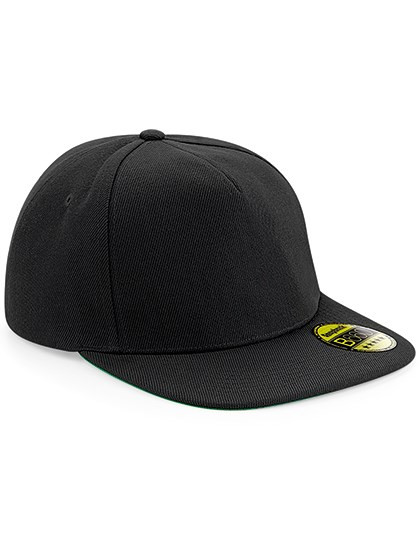 Abgesteppte Belüftungsösen | 5-Panel-Design | Style mit flachem Schirm | Snapback-Größeneinsteller im Retro-Stil | Schirmunterseite Grün, Black/Black/Black: Schwarze Schirmunterseite | Polyester-Twill | Original Aufkleber auf dem Schirm