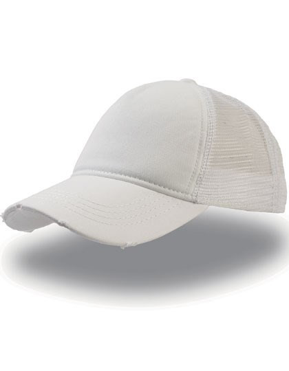 5 Einsätze | Strukturierter vorderer Einsatz | Vorgebogener Schirm | PVC-Verschluss | Baumwoll Schweißband | Schirm mit Destroyed-Effekt | Mesh hinten und seitlich | Vier Ziernähte auf dem Schirm | Chino-Baumwolle und Polyester-Mesh