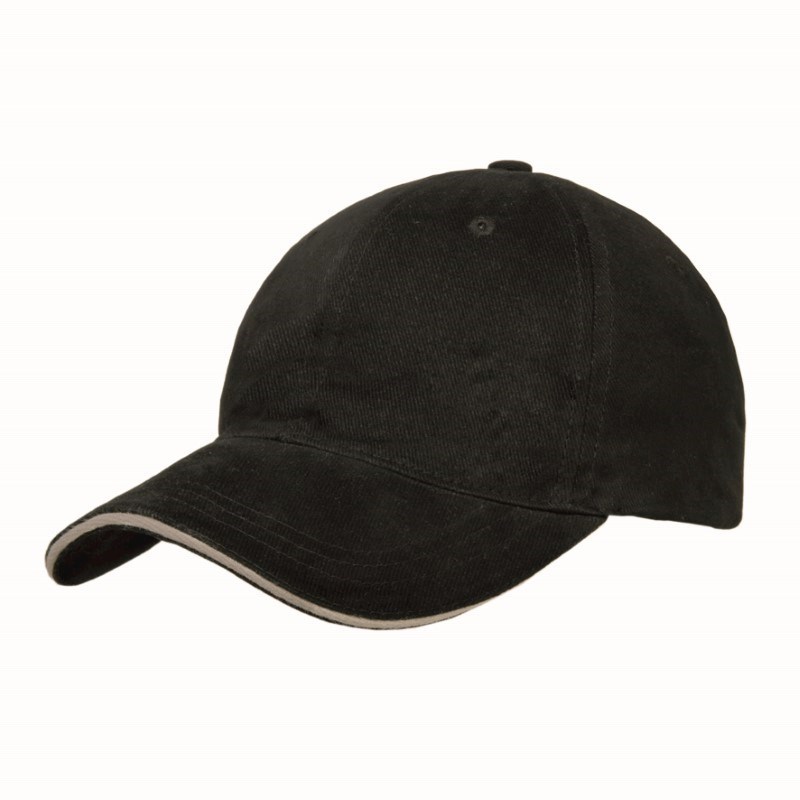 6 panel sandwich Cap ohne Frontfütterung. Low profile. Offener Metall buckle Verschluss mit Öse. Ausgeführt in heavy brushed cotton