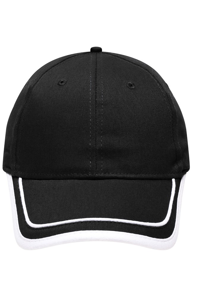 Schild mit Einfassung und Piping in Kontrastfarbe 6 gestickte Luftlöcher Laminierte Frontpanels Gefüttertes Satinschweißband Klettverschluss Brushed Cotton.