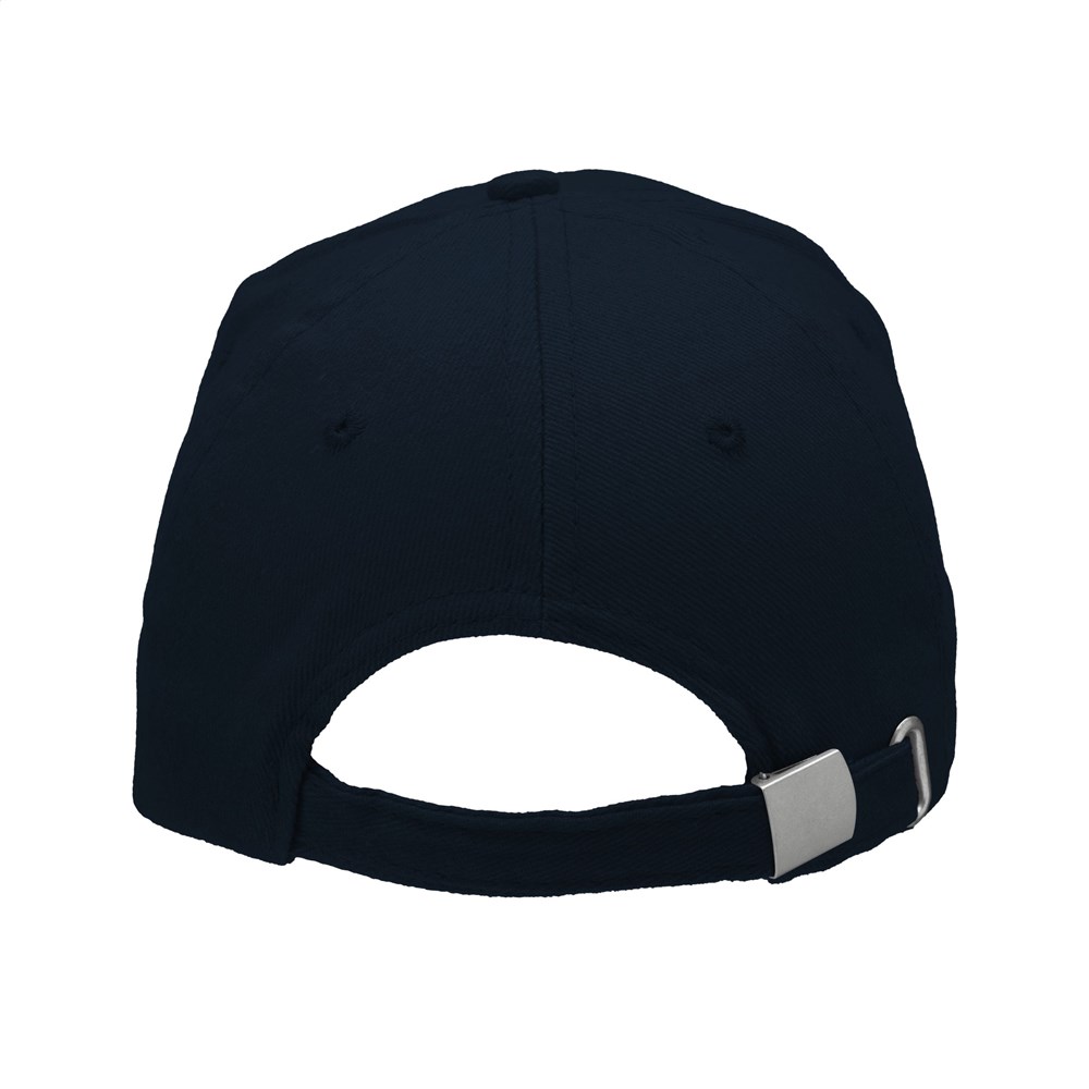 Starke Baseballkappe in besonders schwerer Qualität. Aus 100% gekämmter Baumwolle mit vorgeformtem Schirm und verstellbarem, metallenem Clipverschluss an der Rückseite.