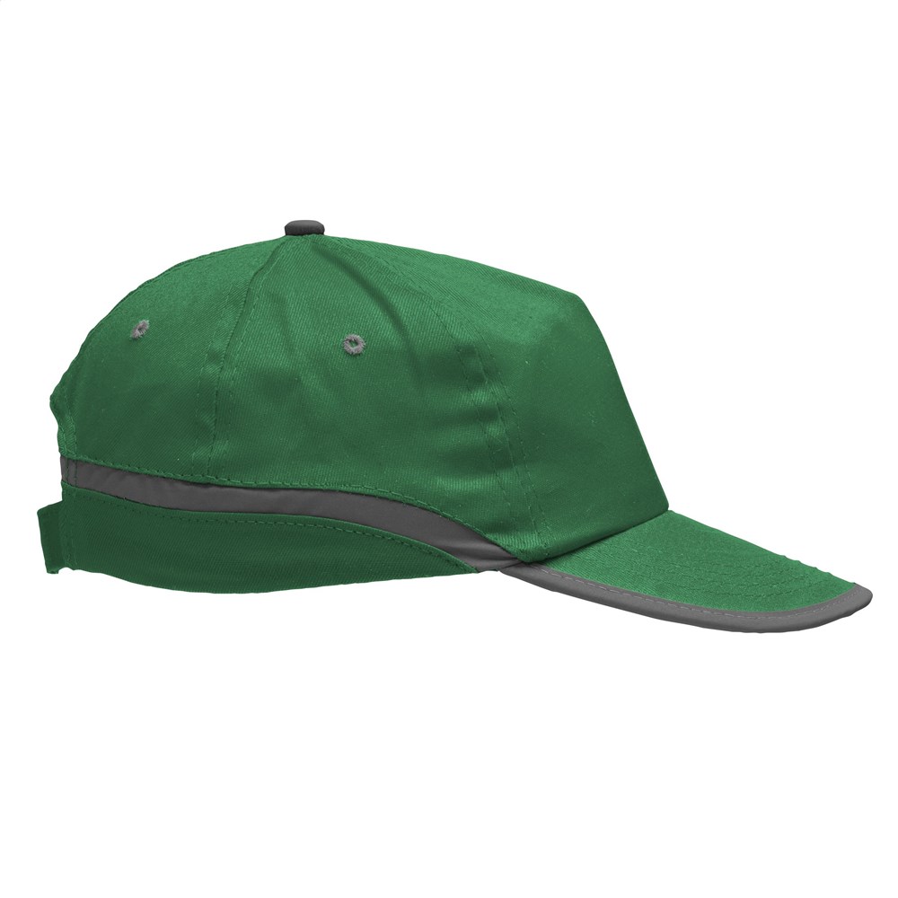 Baseballkappe aus 100% Baumwolle mit reflektierendem Streifen, vorgeformtem Schirm und Klettverschluss.