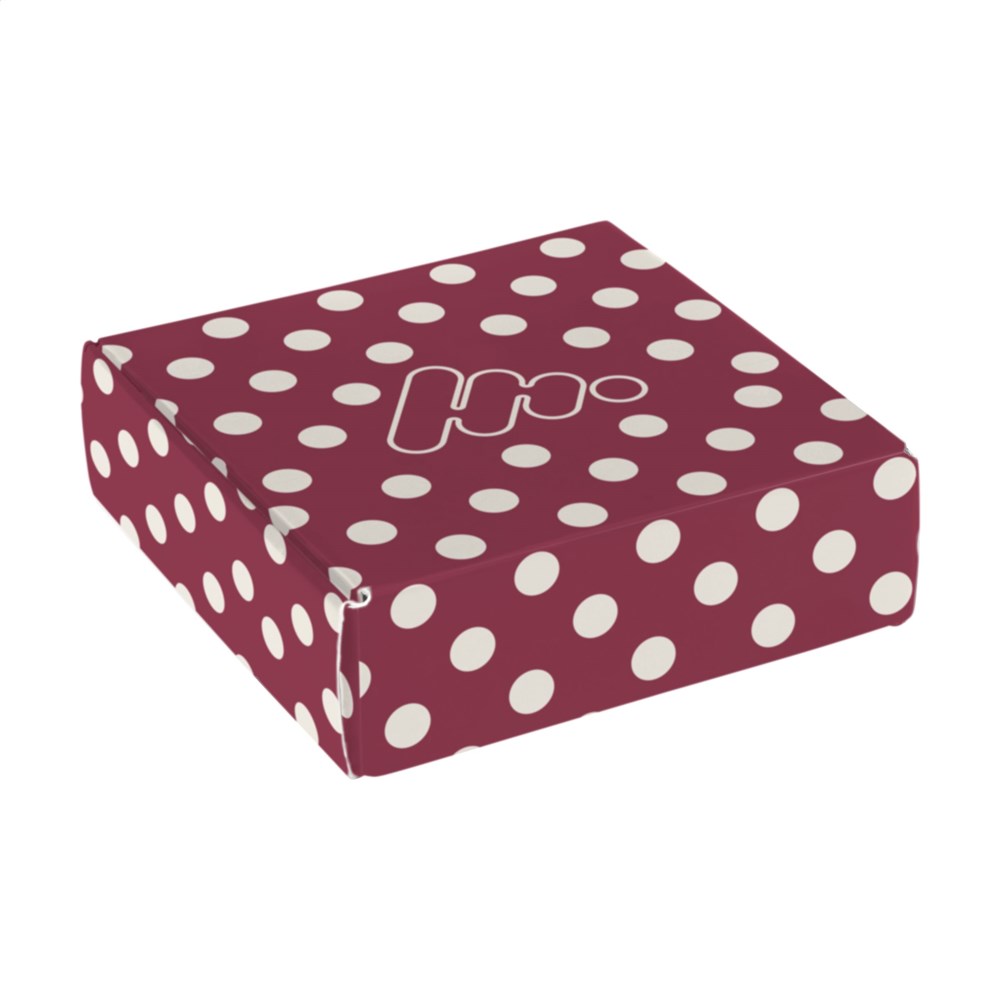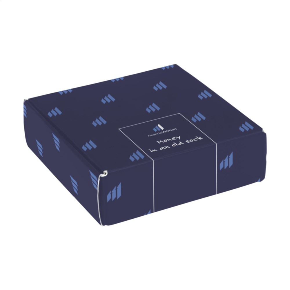 Geschenkverpackung für Socken (Artikelnrn. 4073 und 4074). Diese Geschenkverpackung aus 350-Gramm-Papier ist mit einem vollfarbigen, individuellen Design erhältlich. Auf diese Weise können Sie die Verpackung perfekt auf das vollfarbige Etikett abstimmen, das an den individuell gestalteten Socken befestigt ist. Eine tolle Kombination für ein komplettes Werbegeschenk.