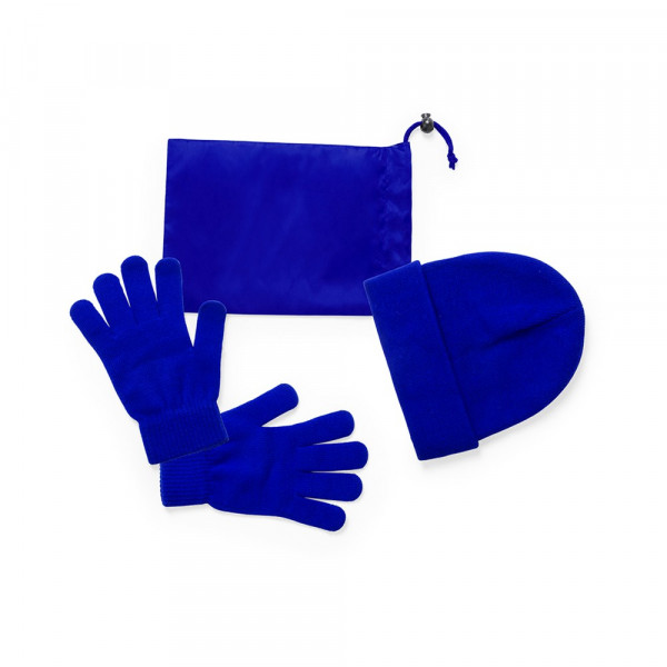 Winter-Set aus einer weichem und warmem Polyester/Acryl-Kombination in kräftigen Farben. Enthält ein Paar Handschuhe und eine Mütze in passender Farbe. Präsentiert in einer farblich passenden Polyesterhülle mit Kordelzug und Stopper.