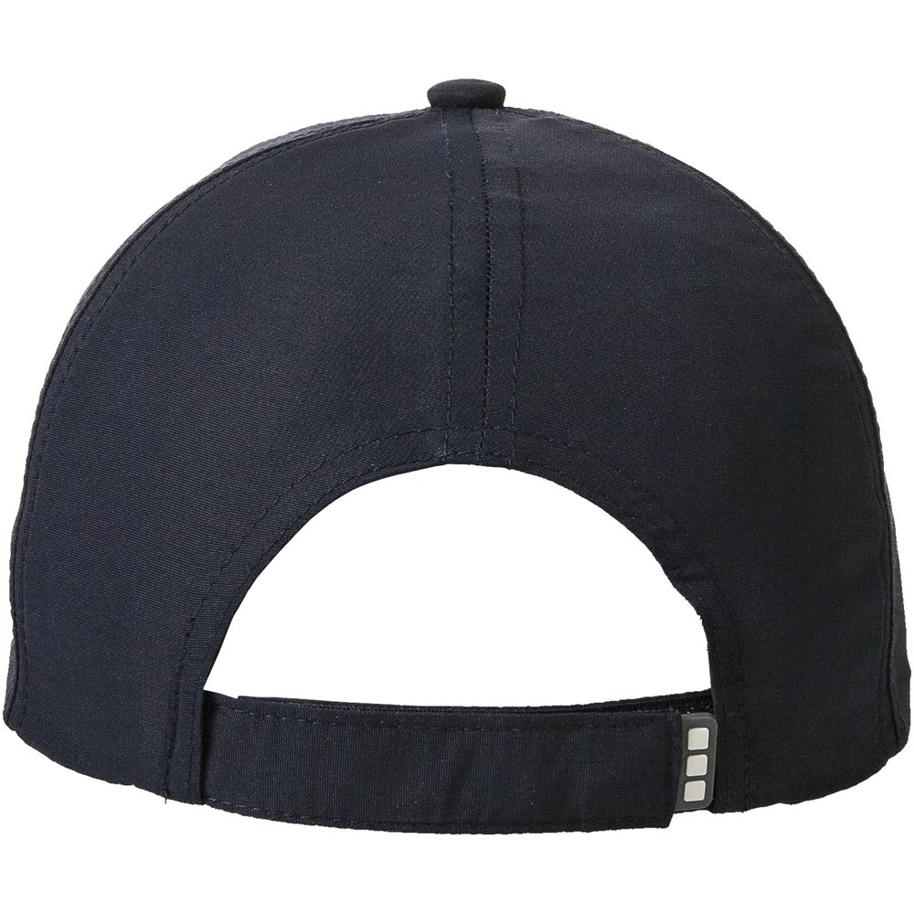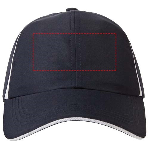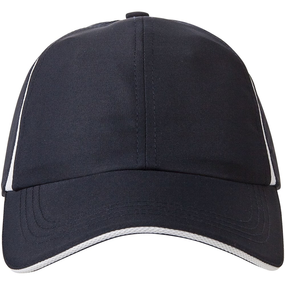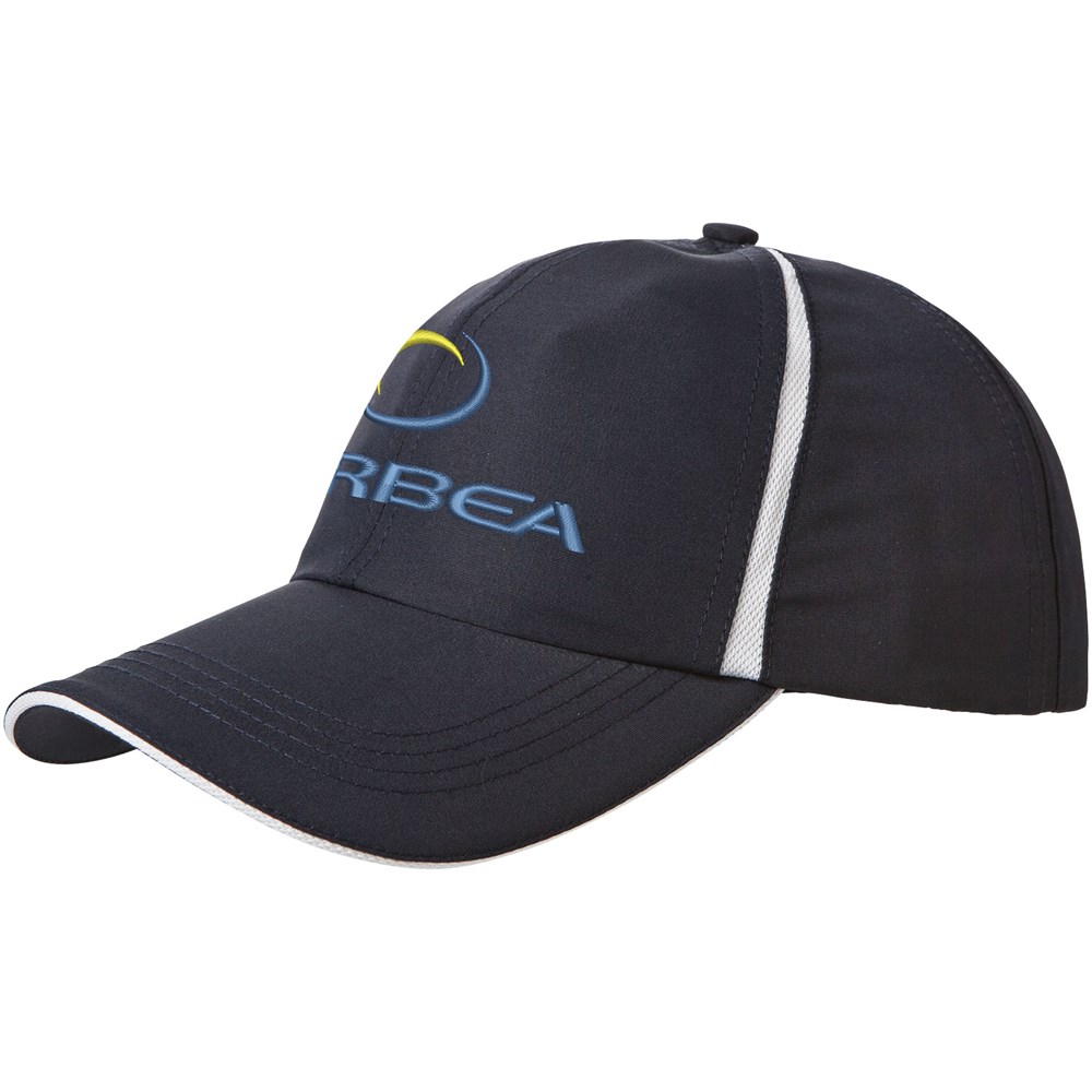 Gebogener Schirm mit Sandwich. Seiteneinsätze aus Netzmaterial. Klettverschluss aus Stoff mit Gummi-Logolasche. Kopfumfang: 58 cm.