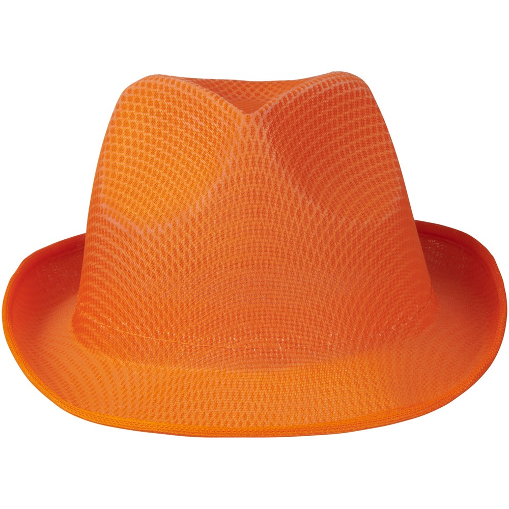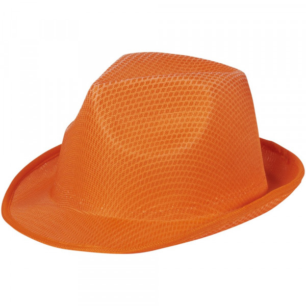 Ein Polyesterhut im Trilby-Stil mit einem Kopfumfang von 58 cm ; Einheitsgröße. Die Hüte können auf dem Zierband aus Polypropylen (100 g/m²) individuell mit Logos usw. gestaltet werden.