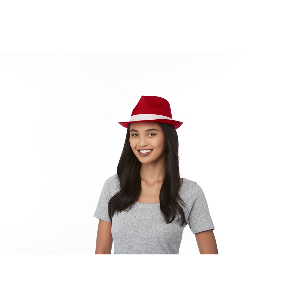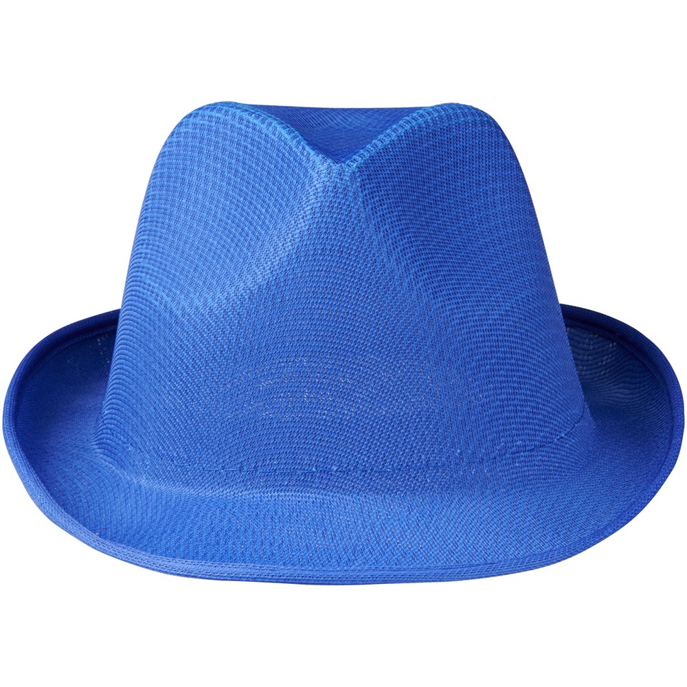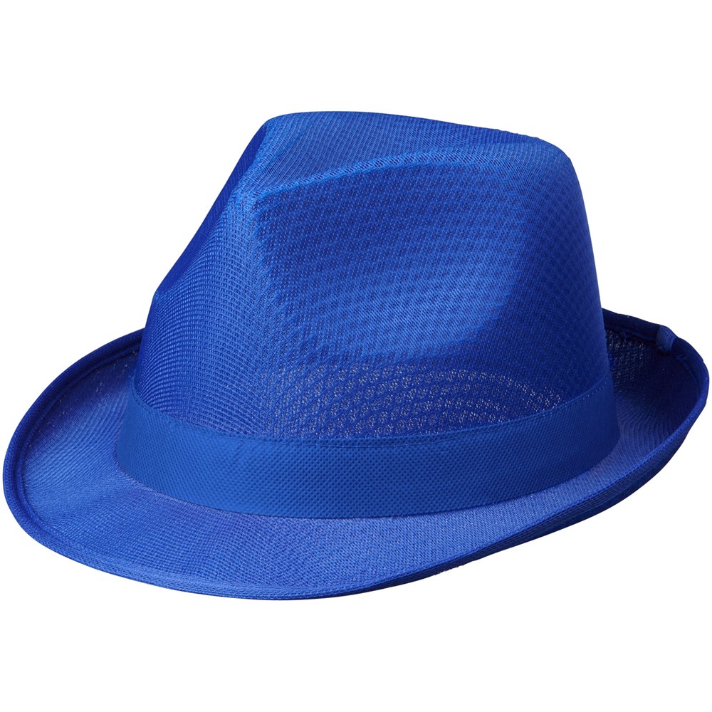 Ein Polyesterhut im Trilby-Stil mit einem Kopfumfang von 58 cm ; Einheitsgröße. Die Hüte können auf dem Zierband aus Polypropylen (100 g/m²) individuell mit Logos usw. gestaltet werden.