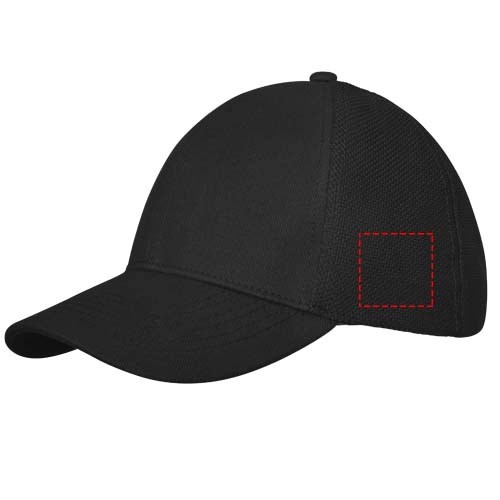 Gebogener Schirm. Rückenpaneele aus Mesh-Gewebe. Verschluss und Schlaufe aus Stoff.