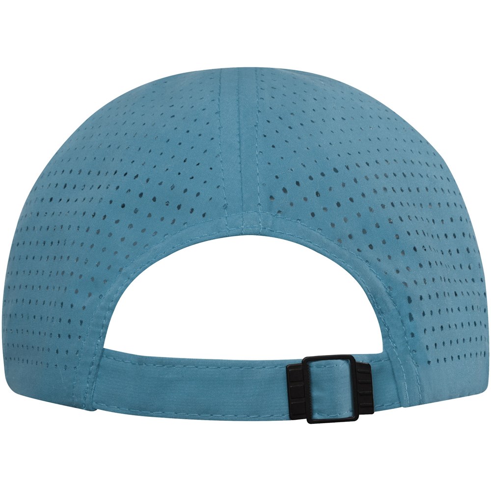 Nachhaltige Kappe für Werbezwecke. Vorgebogener Schirm. Hintere Segmente mit gelaserten Belüftungslöchern. Schnallenverschluss aus Metall