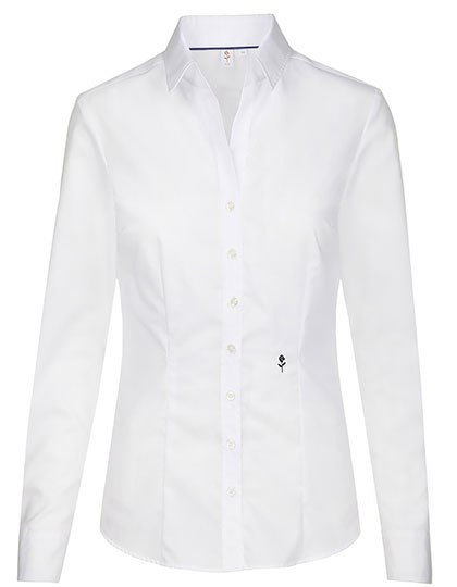 Damenbluse aus 100% Baumwolle | Fil a fil | Bügelfrei | Kentkragen | Doppelknopfmanschette | Abnäher für die taillierte Passform | Langarm | Schwarze Rose-Stick auf dem Vorderteil